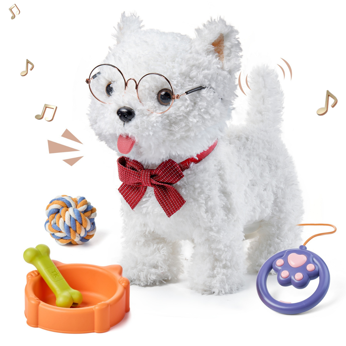 Merge, canta, latra si misca din coada. Include lesa cu telecomanda, ochelari de vedere, minge, zgarda-fundita, bol si os de jucarie.